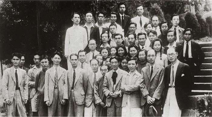 1942年,重庆中央大学艺术系师生合影。前排左起傅抱石、徐悲鸿、黄显之、陈之佛。(宋步云摄影)