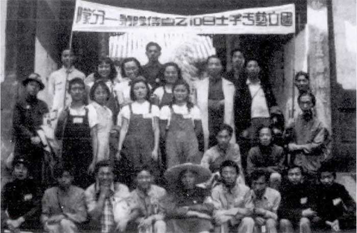 1939年江津县城庆祝私立武昌艺术专科学校建校19周年合影:(前排左起)徐子衍(左三)、唐义精(左四)、蒋兰圃(左五)、唐一禾(左九)