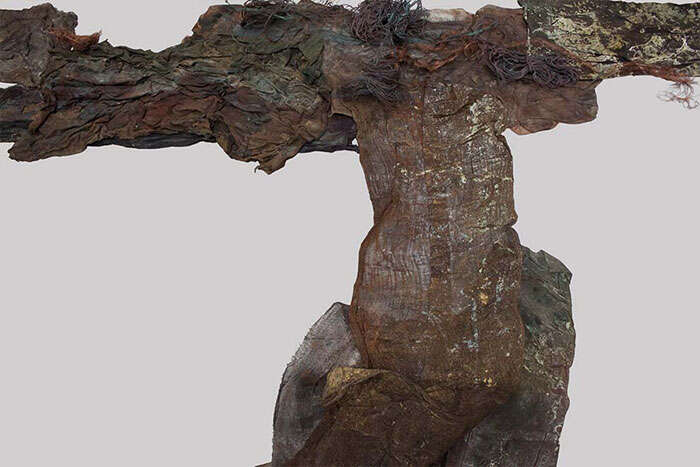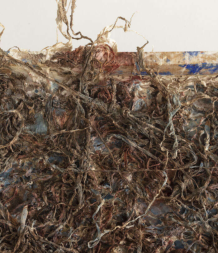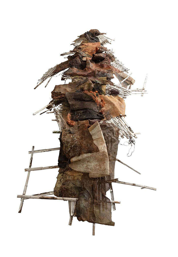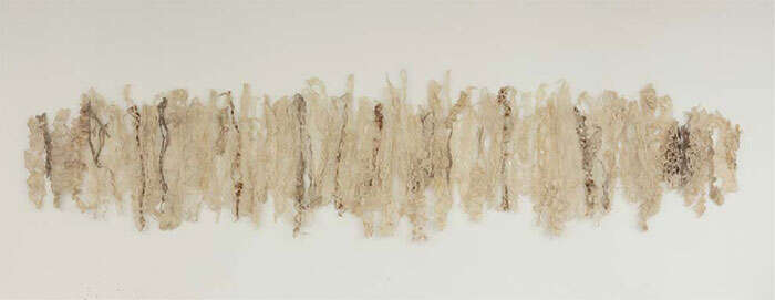 本次展览中,艺术家石梅的最新作品《一刀流》展现了她在综合材料方面的最新实践。老旧残碎的丝麻织物和带有腐蚀感的金属铁丝,是石梅在作品中反复使用和表达的媒材,以矿物和植物染料精心又耐心地反复染就,石梅为她的作品赋予了一种时间的自然留痕。从早期作品《韵》到近年来的新作《一刀流》《牧神午后》等,材料的语义被不断拓展和丰富。自然的留痕,起伏变化的形态,丝丝斑驳间演绎着叙述的不朽。