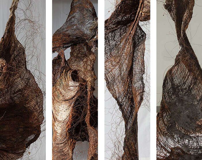 Q:丝麻织物和蚀化后的金属丝是您在作品中反复使用的材料,这两种材料给您什么样的感觉?两种材料语言在您的创作中经历了怎样的演变?