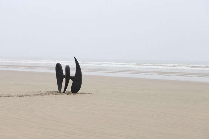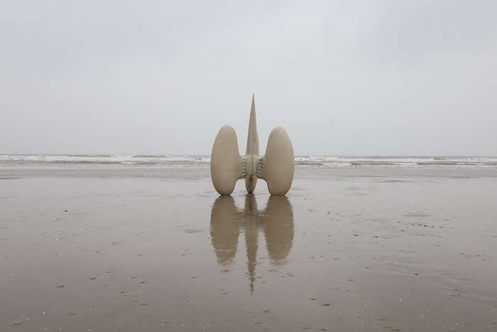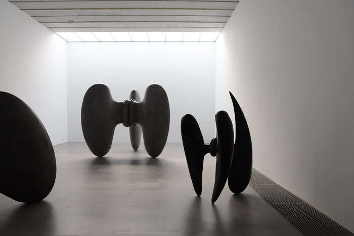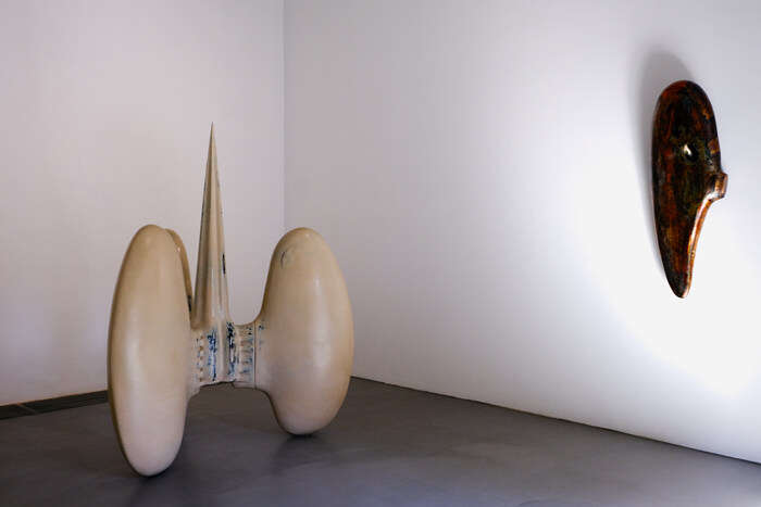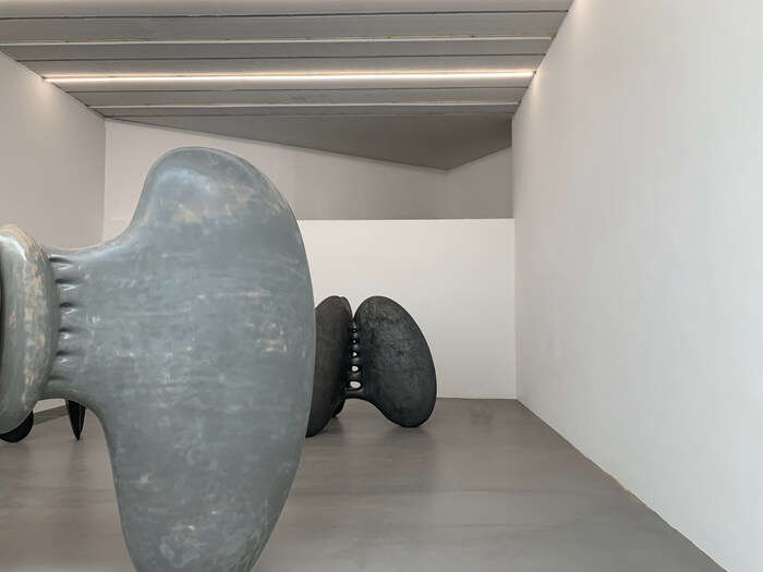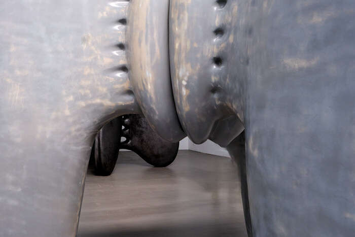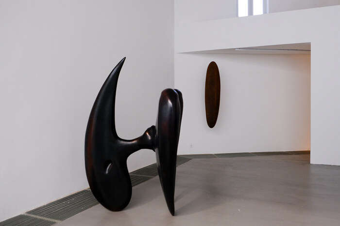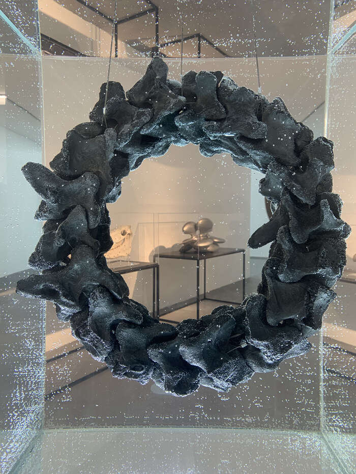 展厅中的装置以平衡圆融的姿态被古朴的大漆包裹,尖锐的骨刺仍旧倔强地打破着空间的圆钝与平静,构筑的巨大骨骼恍若来自硕大远古生物的脊背,此时的展厅似乎化作了逍遥游中鲲的内腔……这是孙文佳2023年春天于Yuan Museum的个展,呈现了艺术家两年来的思考与创作的雕塑装置作品,有名“万物归栖”。