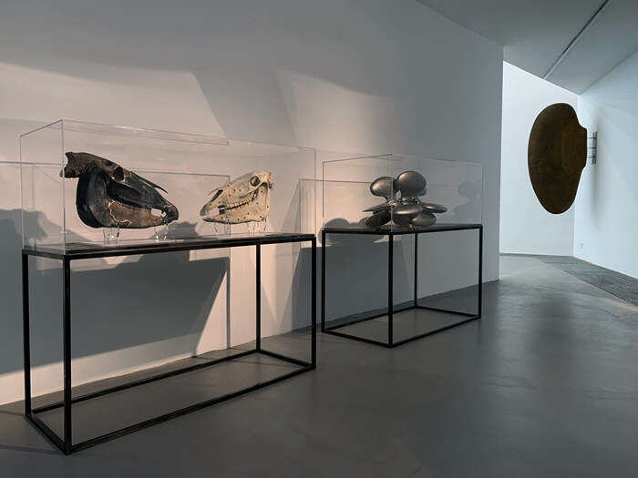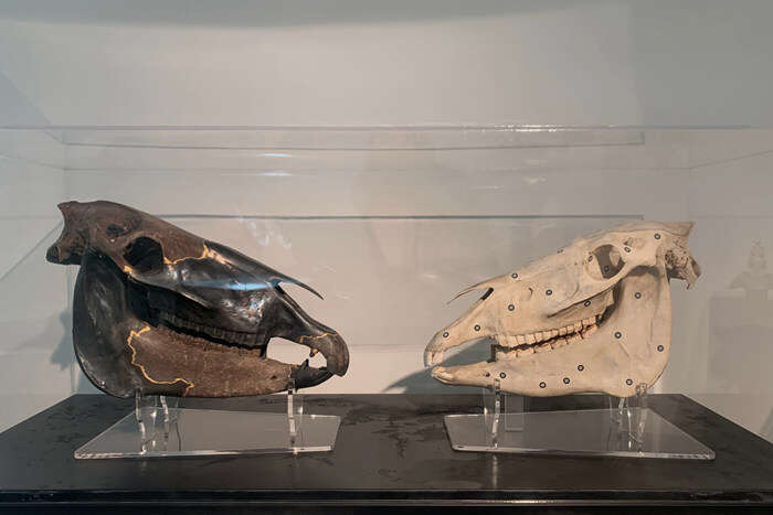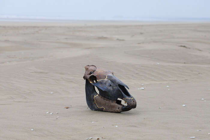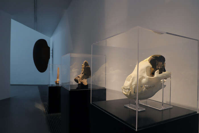 谈到为什么会创作这批新作,孙文佳坦言在“物演”之后,他便将目光收回,专注于了从青少年时期就沉迷其中的生物化石。巨鬣狗、古兽马、古犀牛、海龟甚至是年少时收藏的幼猫头骨,直至今日都令他迷恋不已。在展厅中,孙文佳便以大漆为修葺材料,饰以金粉髹饰古生物的脊椎与头颅——髹漆后的完整模型与残损的化石两相对照,物性与时间性便在这种相对中产生了对话与共振。大漆在这时,便成为了一种具有连接属性的媒介,链接着不同的物态,也链接着千万年的时间。