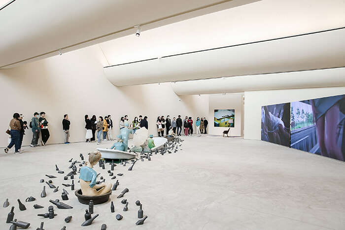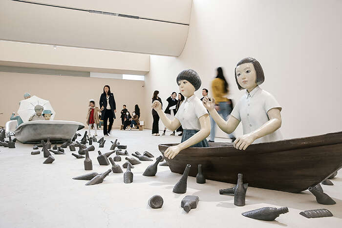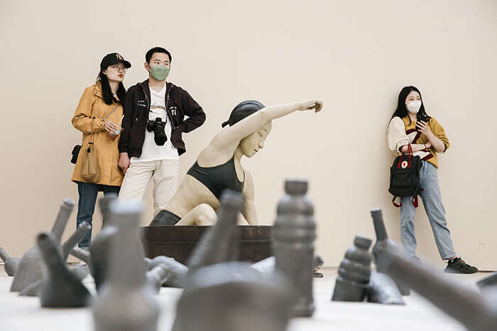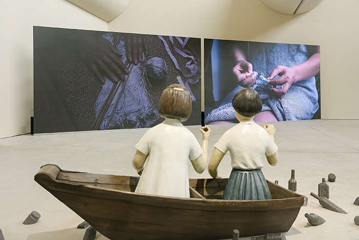 “向京和邢丹文是第一次在一个空间单独对话,作品本身也具有互文性。两位艺术家在做作品时都是从各自的立场出发,在这个空间相遇之后语境使得作品有了新的变化。艺术家向京雕塑<一件春水向东流>最前面的两个女孩,面对邢丹文影像作品<线>,影像作品中的女孩就是这两位女孩自身的映照。