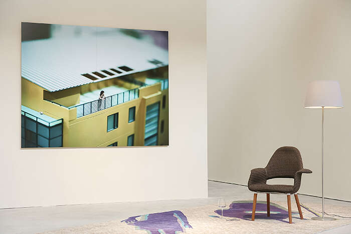 邢丹文数码油画《药》、作品《我无法感到我的感觉》体现了都市生活中人们精神和肉体的双重焦虑。我们怎么去发泄,如何找到平衡?向京雕塑《异境——彼处》给到了答案。作品中延伸的胳膊是对童年意象化的表达,通过我们对彼岸世界的向往、想象,为自己找到一个出口。而整个空间门口处的小女孩在窥视,在门外窥视别人的命运。两位艺术家的作品在空间中完成了二次创作和解读,作品与作品之间产生了新的关联。”