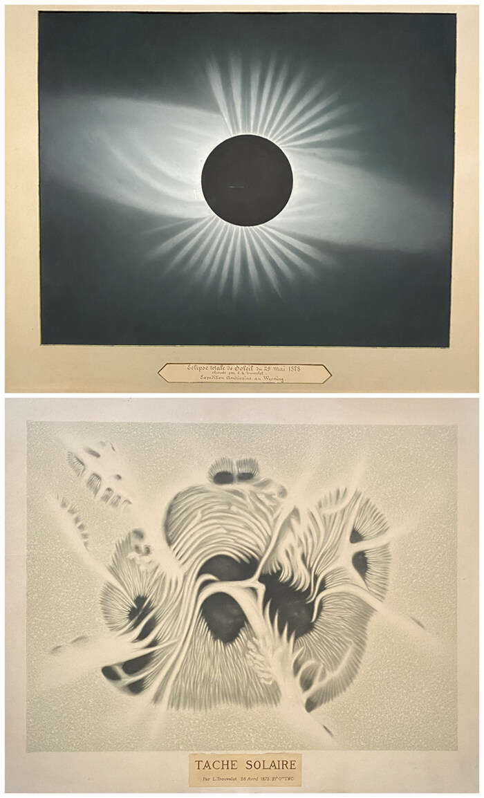 上图:日全食,1878年5月29日;下图:太阳黑子(Sunspots),1875年4月28日,艾蒂安·特鲁夫洛(1827-1895,法国艺术家、天文学家暨业余昆虫学家),法国巴黎天文台