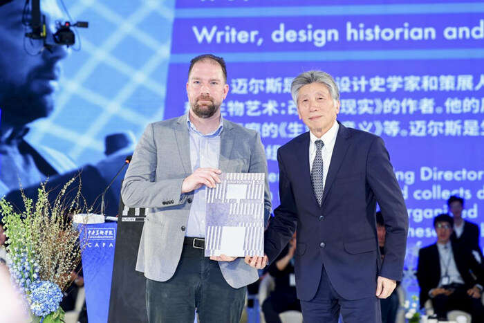 中央美术学院院长、中国美术家协会主席范迪安在论坛现场为《生物设计》作者、设计史学者、策展人威廉 · 迈尔斯(William Miles)颁发客座教授证书