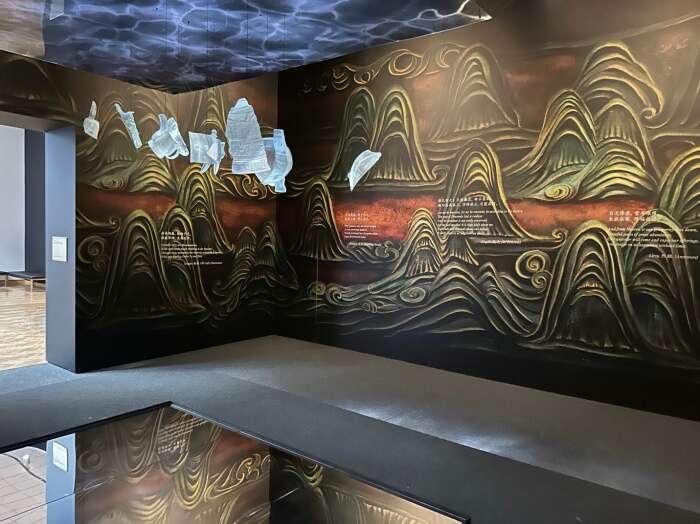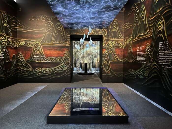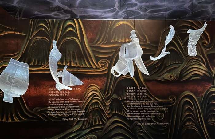 序幕《场景设定》,其中的群山壁画、出自《诗经》的诗句、悬幕,镜子以及悬浮的3D打印“青铜器残块”