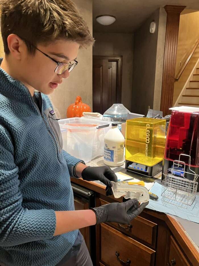 山姆接下来几周紧张、累人的项目就此开启。山姆平时给我的印象是一个稍微有点内向和害羞的的男孩,但是他对这项工作所表现出来的热情、专注与责任感,让我刮目相看。他现有的打印机无法打印我们需要的透明材料,他于是研究了什么型号的打印机可以满足材料的要求,在父母的支持下,独自采购和装备了新的机器。我们要求每个“残块”的长度大约在33厘米左右,山姆的打印机无法打出这么大的东西,所以不得不分成几块来打印,完了后再粘起来。每一个“残块”的打印时间大约需要花7-8个小时,时间紧迫,山姆于是让他的打印机除了他上床睡觉以外,连轴转地工作。他安装了一个摄像头,以便在上学时从手机上监控打印机的工作状况。在这期间,山姆和我有许多互动,他妈妈也不断地报告进度,分享山姆带着防护面罩工作时的照片。紧赶慢赶,十块“青铜器残块”终于在开幕前的最后一周完成了。