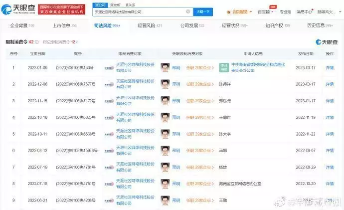 上次关站后,有传闻称国内元宇宙初创公司区块城市(BlockCity)将并购天涯社区,但这一消息尚未得到明确印证。不过,如今的天涯可谓是举步维艰,天眼查App显示,该公司目前存在6条被执行人信息,累计执行标的超1.46亿元。同时,该公司及创始人邢明还存在数十条限制消费令。此外,该公司还涉及数百桩案件,案由包括名誉权纠纷、侵害作品信息网络传播权纠纷等。