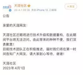 4月1日,天涯社区曾发布公告称,天涯社区近期将进行技术升级和数据重构,在此期间平台将无法访问。