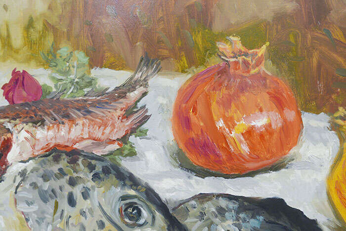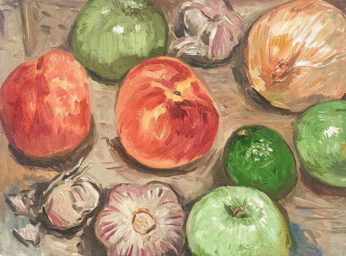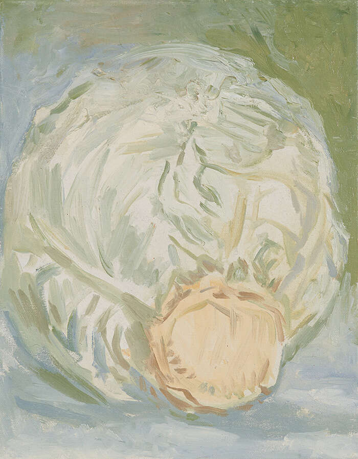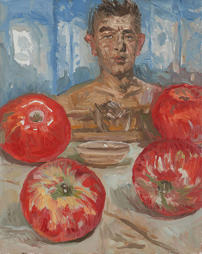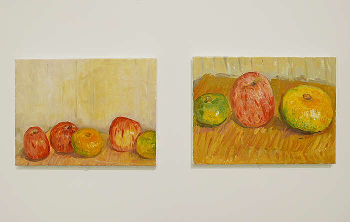 食物、花卉、人物是这次展览作品的主要题材,其中还穿插了一些风景元素。艺术家描绘了许多石榴、苹果、圆白菜等很常见的静物,这些静物被安排在了一个并不明确的空间中,它们仿佛有了像人一样的性格。