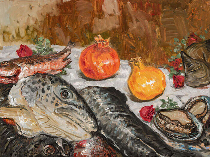 我们很容易被倪军作品里雅致的色彩所吸引,但正如艺术家本人所说,它们都承载着故事。时光渗透在艺术家的笔下,让我们直面生命的存在状态。作品里的黑色点醒了画面,让作品有一种雄浑沧桑的气势,黑色衬出石榴的轮廓,染出鱼的脊背,黑色在中国艺术的传统中有着独特的地位。他用笔如书写,使油彩颇有文人画的自由意趣。