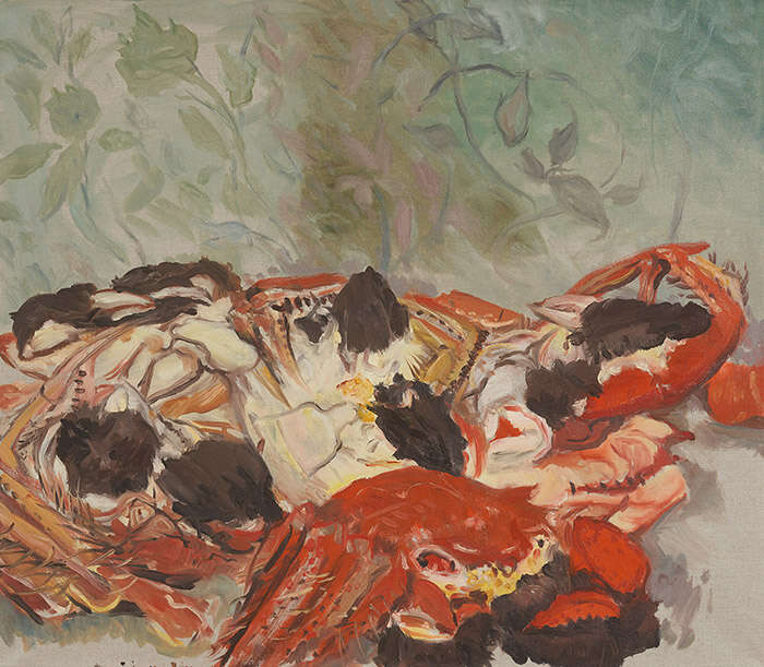 倪军笔下的“肉”张扬着野蛮的生命力,即便它们已被分解。鱼的鳞片上寒光闪烁,仿佛利刃,颇具攻击性,撑满画布的螃蟹张牙舞爪,这一切似乎都与倪军的海洋记忆有关。世界分为两部分,人类或许征服了陆地,但在大海面前,还得保持敬畏,也要随时准备与其搏斗,让这些生物乖乖进入人类的厨房。