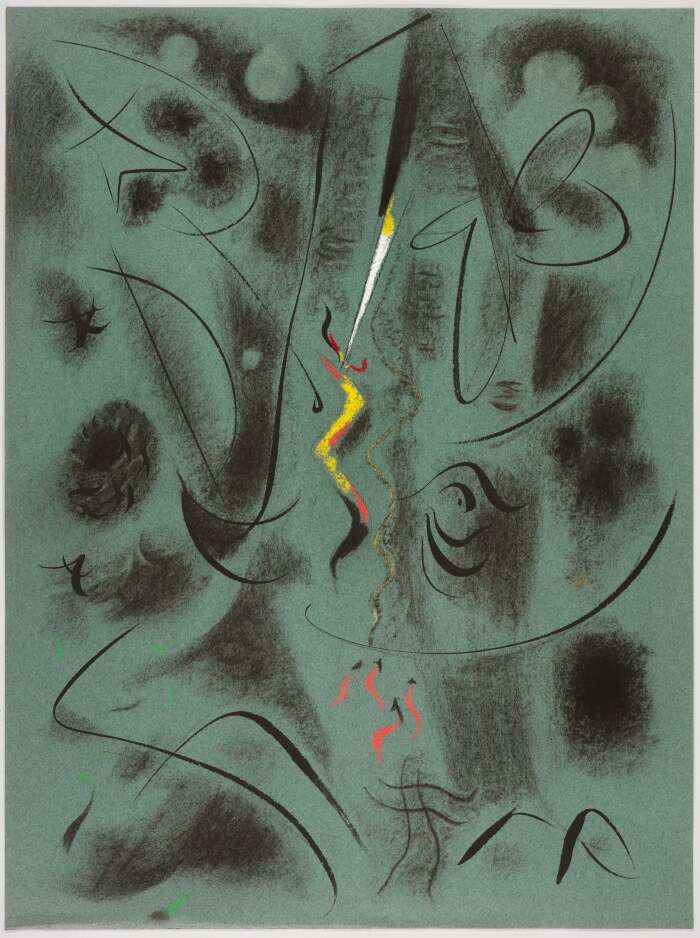安德烈·马松,遭雷击的树,1945年,炭条、墨水和粉彩绘于绿色纸上,60.8 × 45.5 厘米 ©巴黎,蓬皮杜中心,法国国家现代艺术博物馆-工业设计中心