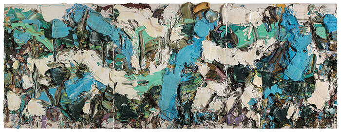 《失去白云》三联作品则代表了艺术家从上世纪八十年代就开始的多联系列的长卷风格。2017年《痛的六月之一》与《临山一诺之二》隐喻出社会与个人的历史处境。疫情之后的《镜中谷》《没有火烧连营》《悲伤飘满池塘》让人联想到新的世界图景。朱金石在2020年之后的“厚绘画”中,与现实的关联承诺了绘画与社会学无法脱离的纠葛,总之,绘画社会学不是装置社会学,杜尚、博伊斯的时代翩然远去,当代绘画的优势在于激情、沉思、纠缠、矛盾、悲哀、迷茫、痛苦和快乐,它使社会有更多情感,更多直觉,更多偶然。朱金石在画布上“堆砌”“搅拌”“提按”,夸张的厚度、浓烈的痕迹以及三维的空间感,使颜料的物质性凸显出来。超载的美学和立体的视角,革新了对油画颜料与画布的相互承载关系,材料、体积、时间、空间相互作用,构成作品无限的开放性。