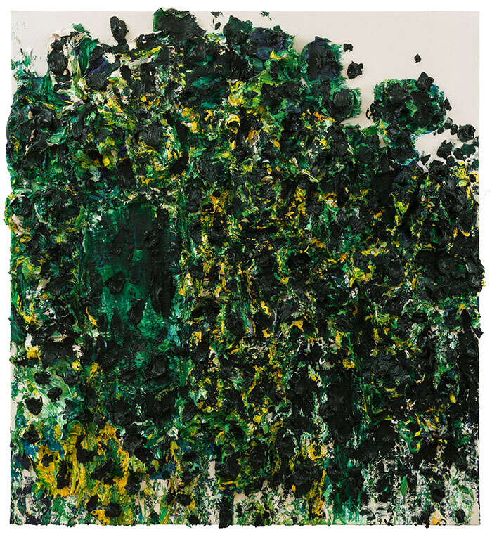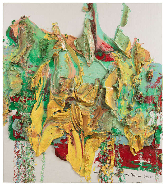 不难发现,朱金石其实不是一个简单的画家,他更多是在思考“架上的历史”,是对绘画形式和绘画体制不断进行研究的观念艺术家。这是一种精神上的态度,也一种行为的理想,由此,我们能更好的理解和观看朱金石的绘画。作为中国最早的抽象绘画和装置艺术实践者,朱金石的“厚绘画”在2000年脱颖而出,《石涛语录》作品是其时的经典。2010年代是其“厚绘画”的高光时期,此次展览也是对这一时间作品的重要展示:如2010年的《火山岩》、2013年《西郊的风》,以及《快递一件风景之一》。