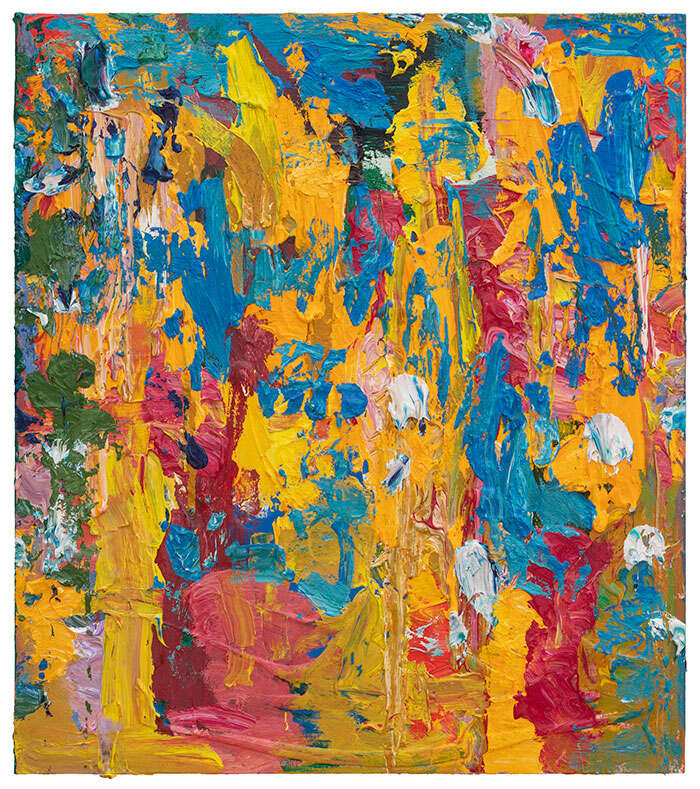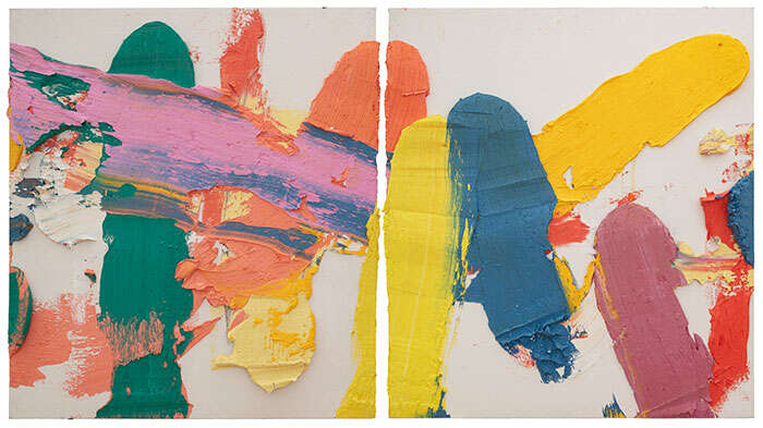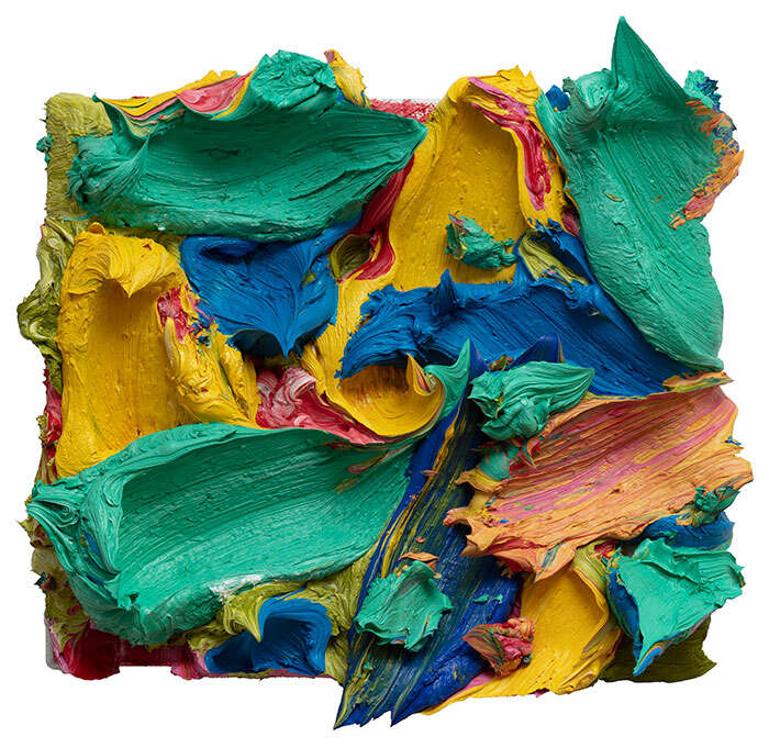 近两年,朱金石还引入了丙烯这一新媒介,既是对过往绘画实践的自我挑战,也是其绘画观念的延伸。艺术家使用不稀释的丙烯颜料直接涂抹画面,令颜料呈现出不同于油画的工业化特质,超饱和的色彩、流动的颜色和多层覆盖的厚重效果,逐渐形成一种更为发散式的空间结构。此次展览还展出了朱金石新的小尺幅厚绘画作品,艺术家认为,小尺幅绘画可以有更多的研究结果,对形成自身绘画系统起到強固作用。朱金石在这些极有限的画布上,运筹帷幄出意想不到的构图考量,使它们重新切磋。