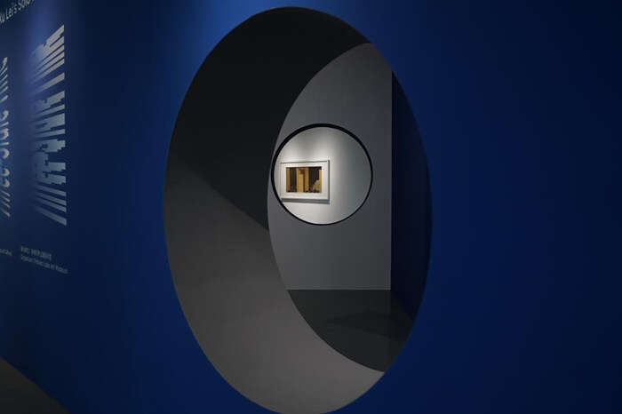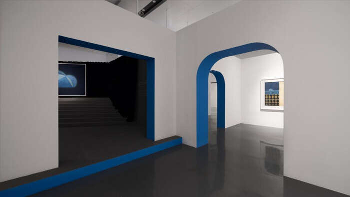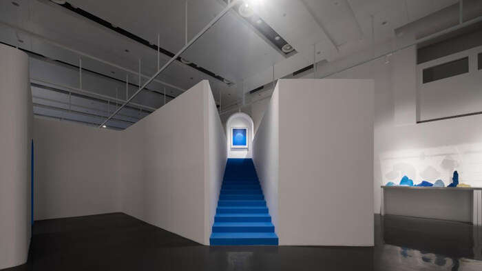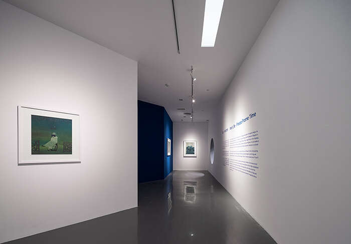 远离喧嚷市区,闹中取静的苏州尹山湖美术馆,展厅设计也颇具江南特色。圆形的窗洞互相映照,跟随45°斜角设计的步道与墙面,也如同苏州园林般移步换景,在展馆蓝色风格的渲染之中,古意渐生。帷幔、重屏、空椅、笼鸟、镜戏、梦蝶、石影,“前生·时间的定格”单元中的大部分作品,都带着类似的古朴意趣。