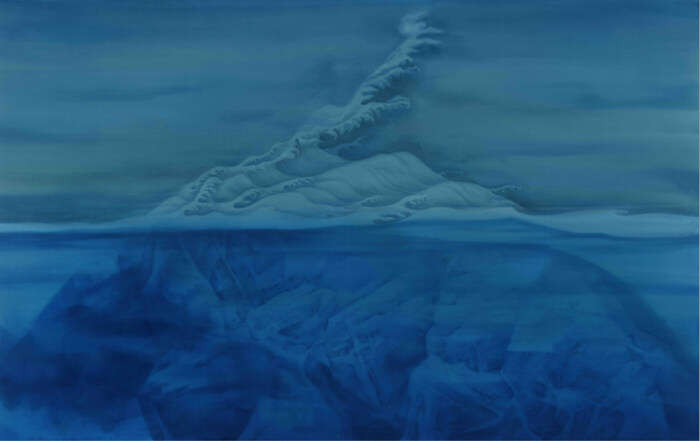 这正是对第一单元“前生·时间的定格”精妙的收尾,而艺术家九十年代作品中的孤独,在进入本世纪后渐渐稀释为一种开阔的平衡。以这一变化为分野,展览进入第二单元“浮生·时间的平行”。《石上浪》以海平面为分界,深水下的巨石掩映在流动与宁静、水面与深渊之间,海平面往上,石头随着无穷漫长的时间渐渐化为洋流与云层,消逝于深邃的天空。在这幅作品中我们发现徐累强调的“绘画符号本身的平衡”,山岳在海平面上下隐现,经过白云苍狗,最后形成一体。