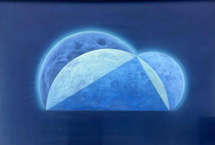 徐累对月亮主题情有独钟,也构成了他近期新作的创作灵晕。他引用伊塔洛·卡尔维诺(Italo Calvino)《命运交叉的城堡》中的语言,形容月亮“是充满意义的世界,包括了那些对词语和事物最完整的诗韵记录。”达·芬奇曾经计算过的“月牙定理”,被艺术家以绘画的形式呈现,作品置于在黑色的幕景中,犹如深沉黑夜下理性秩序与神秘感性的交织显影,也唤起我们心理上的无限测量。