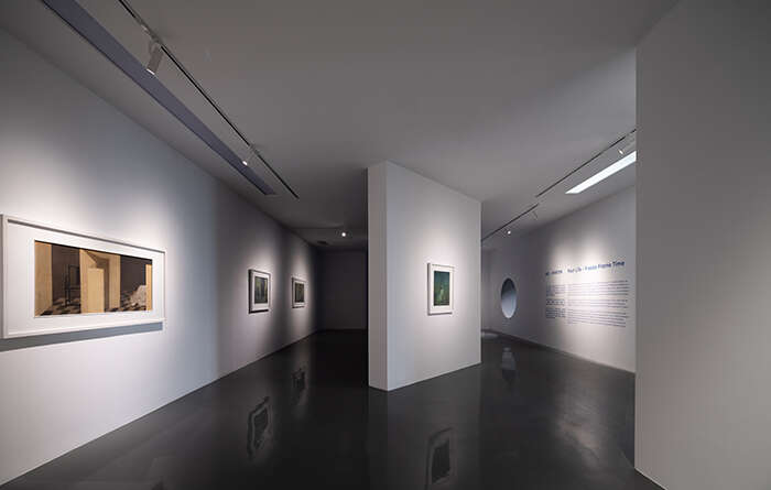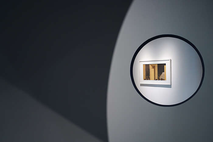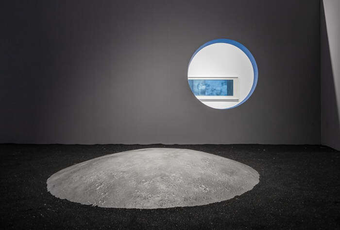 徘徊踱步于展厅之中,在透过互相映照的圆形洞窗,我们看到“永生·时间的寓体”单元以月亮为主题的一系列作品,漂浮在海上的月亮,白昼归巢的月亮,轮回重影的月亮,以及艺术家为苏州尹山湖美术馆本次展览特别构思的装置作品《陨月》——半掩地表,露出表面坑洼的月壤,仿若通往艺术家构筑的理性与浪漫的神秘情境,重新定义了尹山湖美术馆江南园林特色的设计风格。
