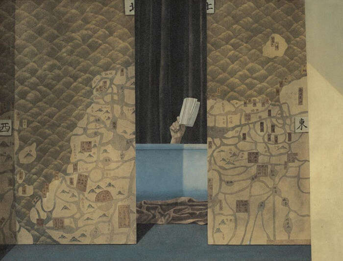 走进展览的第一单元“前生·时间的定格”,舆图如屏风一样向两边打开,露出浴缸中持着书卷的手,透过展厅入口旁的圆窗,我们与“时间三体:徐累的艺术”的第一件作品《虚池记》相遇。背景里如同《山海经》般带着志异色彩的地图,细看下来,各种交叉相径的道路和山川,并非以实际的地理名称标注,而是用蝴蝶谱、古琴名、草药、词牌名代替了原有的城镇、村落与河流,其内容是艺术家想象性的置换。舆图论据详实的考证意味被一种复杂而飘渺的浪漫主义消解,而呈现出一类不可求证、不可寻踪的思维景观。