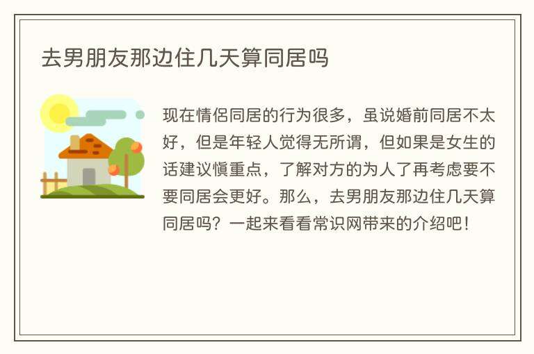 现在情侣同居的行为很多,虽说婚前同居不太好,但是年轻人觉得无所谓,但如果是女生的话建议慎重点,了解对方的为人了再考虑要不要同居会更好。那么,去男朋友那边住几天算同居吗?一起来看看常识网带来的介绍吧!