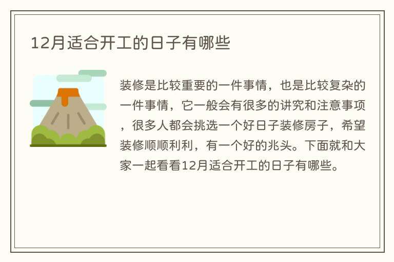 装修是比较重要的一件事情,也是比较复杂的一件事情,它一般会有很多的讲究和注意事项,很多人都会挑选一个好日子装修房子,希望装修顺顺利利,有一个好的兆头。下面就和大家一起看看12月适合开工的日子有哪些。