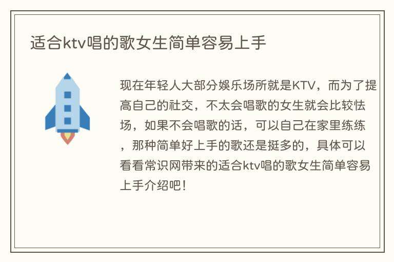 现在年轻人大部分娱乐场所就是KTV,而为了提高自己的社交,不太会唱歌的女生就会比较怯场,如果不会唱歌的话,可以自己在家里练练,那种简单好上手的歌还是挺多的,具体可以看看常识网带来的适合ktv唱的歌女生简单容易上手介绍吧!