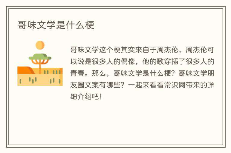 哥味文学这个梗其实来自于周杰伦,周杰伦可以说是很多人的偶像,他的歌穿插了很多人的青春。那么,哥味文学是什么梗?哥味文学朋友圈文案有哪些?一起来看看常识网带来的详细介绍吧!