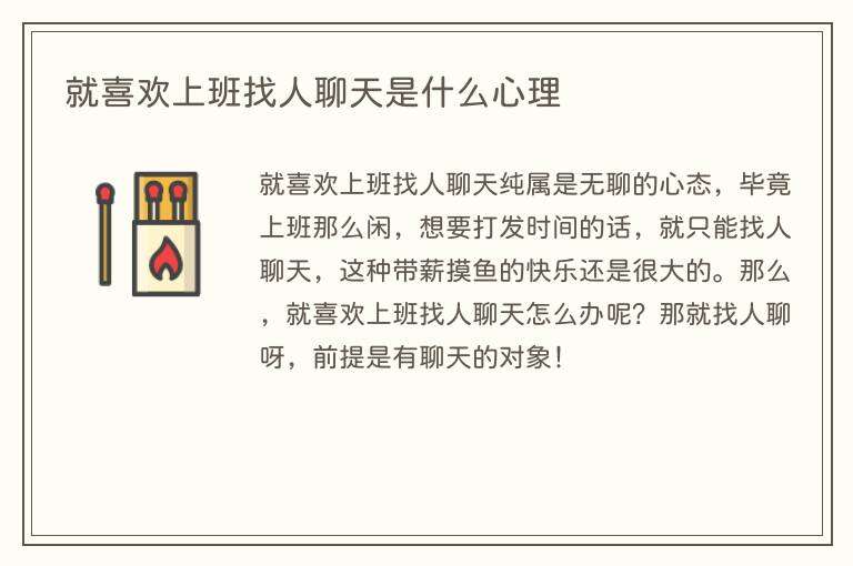 就喜欢上班找人聊天纯属是无聊的心态,毕竟上班那么闲,想要打发时间的话,就只能找人聊天,这种带薪摸鱼的快乐还是很大的。那么,就喜欢上班找人聊天怎么办呢?那就找人聊呀,前提是有聊天的对象!