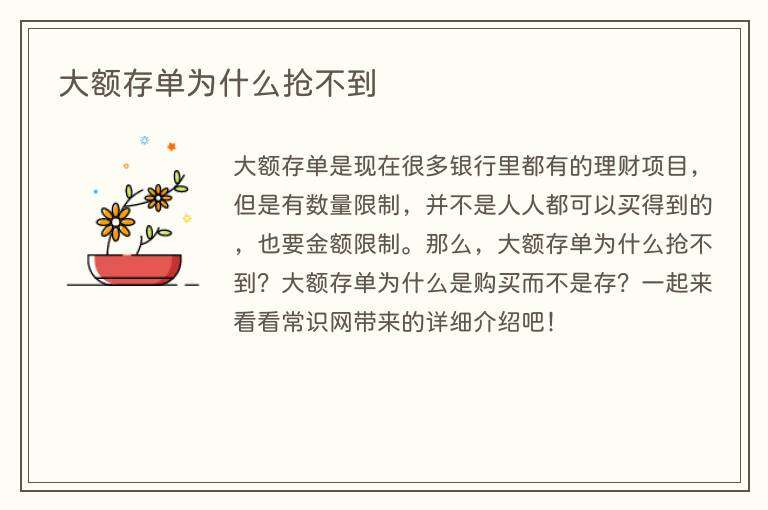 大额存单是现在很多银行里都有的理财项目,但是有数量限制,并不是人人都可以买得到的,也要金额限制。那么,大额存单为什么抢不到?大额存单为什么是购买而不是存?一起来看看常识网带来的详细介绍吧!