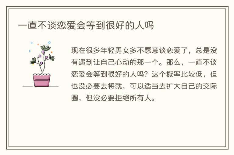 现在很多年轻男女多不愿意谈恋爱了,总是没有遇到让自己心动的那一个。那么,一直不谈恋爱会等到很好的人吗?这个概率比较低,但也没必要去将就,可以适当去扩大自己的交际圈,但没必要拒绝所有人。