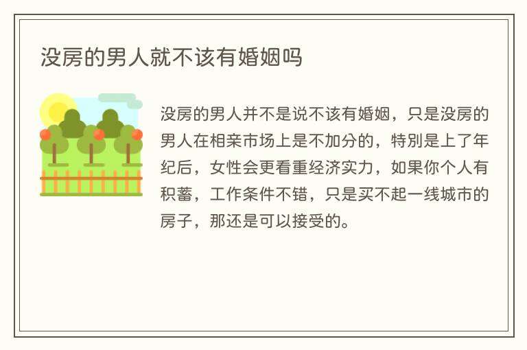 没房的男人并不是说不该有婚姻,只是没房的男人在相亲市场上是不加分的,特别是上了年纪后,女性会更看重经济实力,如果你个人有积蓄,工作条件不错,只是买不起一线城市的房子,那还是可以接受的。