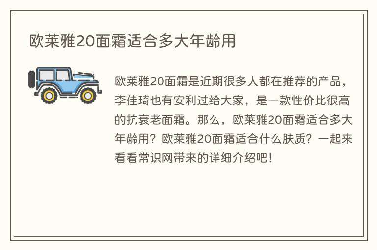 欧莱雅20面霜是近期很多人都在推荐的产品,李佳琦也有安利过给大家,是一款性价比很高的抗衰老面霜。那么,欧莱雅20面霜适合多大年龄用?欧莱雅20面霜适合什么肤质?一起来看看常识网带来的详细介绍吧!