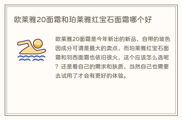 欧莱雅20面霜是今年新出的新品,自带的玻色因成分可谓是最大的卖点,而珀莱雅红宝石面霜和羽西面霜也依旧很火,这个应该怎么选呢?还是看自己的需求和肤质,当然自己也需要去试用了才会有更好的体验。