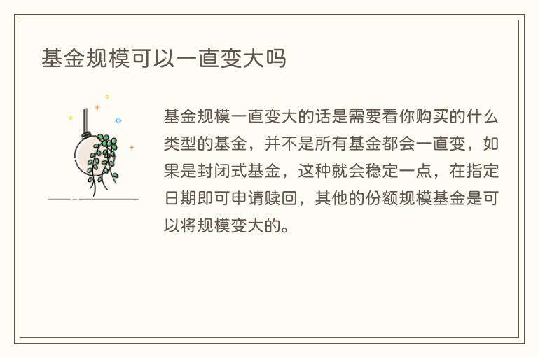 基金规模一直变大的话是需要看你购买的什么类型的基金,并不是所有基金都会一直变,如果是封闭式基金,这种就会稳定一点,在指定日期即可申请赎回,其他的份额规模基金是可以将规模变大的。