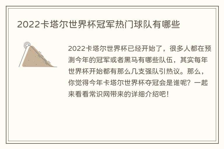 2022卡塔尔世界杯已经开始了,很多人都在预测今年的冠军或者黑马有哪些队伍,其实每年世界杯开始都有那么几支强队引热议。那么,你觉得今年卡塔尔世界杯夺冠会是谁呢?一起来看看常识网带来的详细介绍吧!