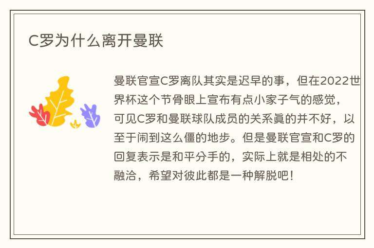 曼联官宣C罗离队其实是迟早的事,但在2022世界杯这个节骨眼上宣布有点小家子气的感觉,可见C罗和曼联球队成员的关系真的并不好,以至于闹到这么僵的地步。但是曼联官宣和C罗的回复表示是和平分手的,实际上就是相处的不融洽,希望对彼此都是一种解脱吧!
