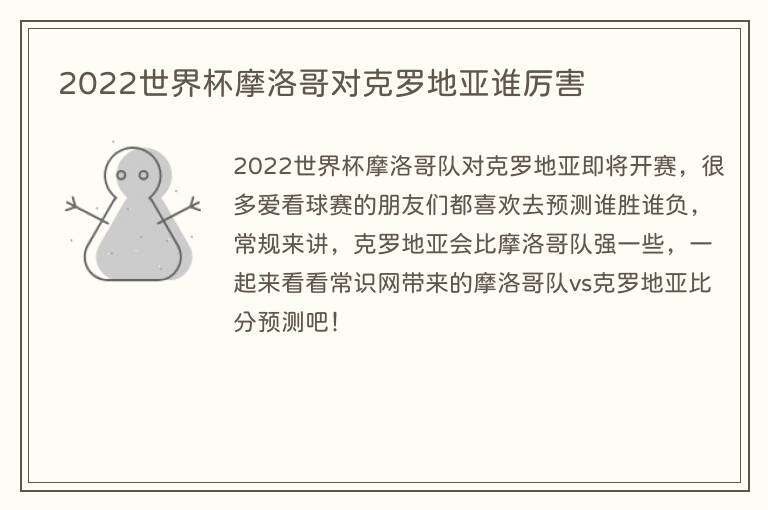 2022世界杯摩洛哥队对克罗地亚即将开赛,很多爱看球赛的朋友们都喜欢去预测谁胜谁负,常规来讲,克罗地亚会比摩洛哥队强一些,一起来看看常识网带来的摩洛哥队vs克罗地亚比分预测吧!
