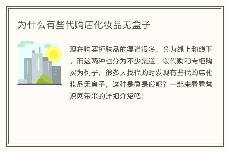 现在购买护肤品的渠道很多,分为线上和线下,而这两种也分为不少渠道,以代购和专柜购买为例子,很多人找代购时发现有些代购店化妆品无盒子,这种是真是假呢?一起来看看常识网带来的详细介绍吧!