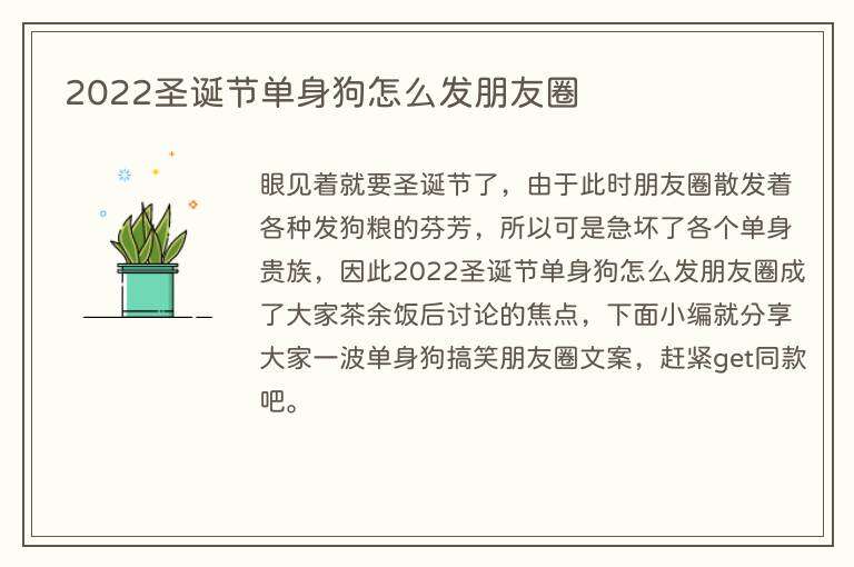 眼见着就要圣诞节了,由于此时朋友圈散发着各种发狗粮的芬芳,所以可是急坏了各个单身贵族,因此2022圣诞节单身狗怎么发朋友圈成了大家茶余饭后讨论的焦点,下面小编就分享大家一波单身狗搞笑朋友圈文案,赶紧get同款吧。