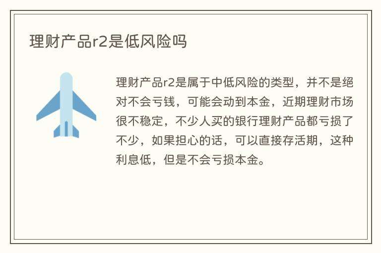 理财产品r2是属于中低风险的类型,并不是绝对不会亏钱,可能会动到本金,近期理财市场很不稳定,不少人买的银行理财产品都亏损了不少,如果担心的话,可以直接存活期,这种利息低,但是不会亏损本金。
