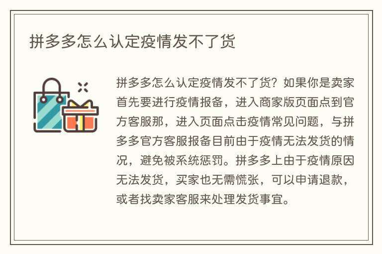 拼多多怎么认定疫情发不了货?如果你是卖家首先要进行疫情报备,进入商家版页面点到官方客服那,进入页面点击疫情常见问题,与拼多多官方客服报备目前由于疫情无法发货的情况,避免被系统惩罚。拼多多上由于疫情原因无法发货,买家也无需慌张,可以申请退款,或者找卖家客服来处理发货事宜。