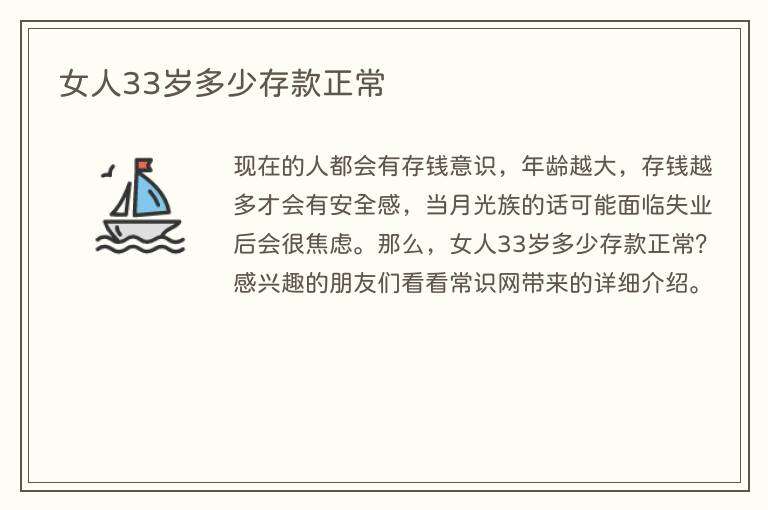 现在的人都会有存钱意识,年龄越大,存钱越多才会有安全感,当月光族的话可能面临失业后会很焦虑。那么,女人33岁多少存款正常?感兴趣的朋友们看看常识网带来的详细介绍。