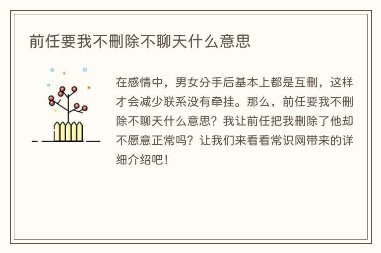 在感情中,男女分手后基本上都是互删,这样才会减少联系没有牵挂。那么,前任要我不删除不聊天什么意思?我让前任把我删除了他却不愿意正常吗?让我们来看看常识网带来的详细介绍吧!