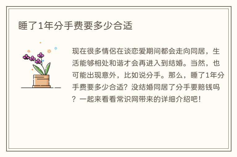 现在很多情侣在谈恋爱期间都会走向同居,生活能够相处和谐才会再进入到结婚。当然,也可能出现意外,比如说分手。那么,睡了1年分手费要多少合适?没结婚同居了分手要赔钱吗?一起来看看常识网带来的详细介绍吧!