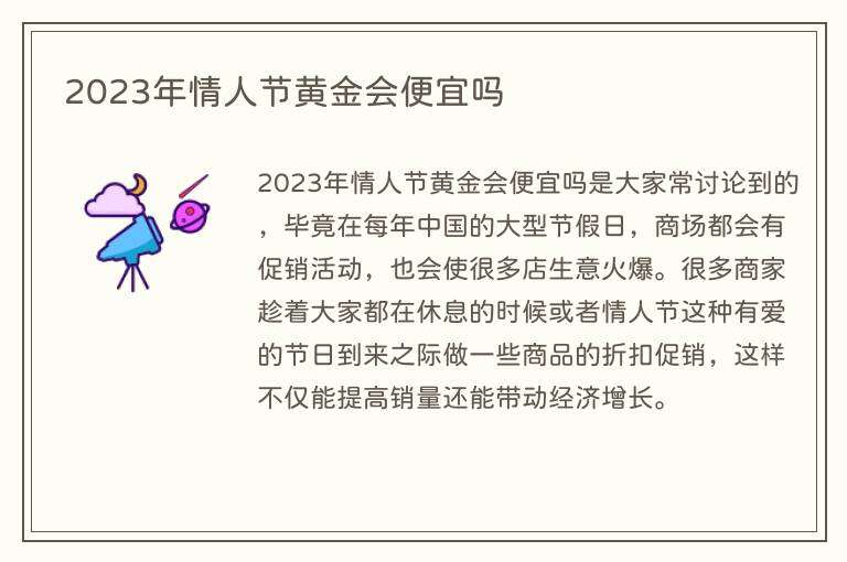 2023年情人节黄金会便宜吗是大家常讨论到的,毕竟在每年中国的大型节假日,商场都会有促销活动,也会使很多店生意火爆。很多商家趁着大家都在休息的时候或者情人节这种有爱的节日到来之际做一些商品的折扣促销,这样不仅能提高销量还能带动经济增长。