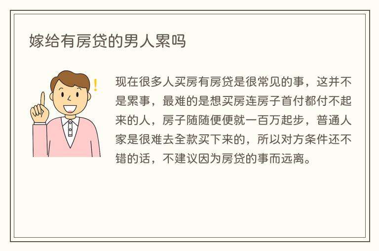 婚姻关系是建立在互相尊重和理解的基础上,无论男女都需要承担一定的责任和义务。嫁给有房贷的男人并不会自动导致累,主要取决于夫妻之间的理解和配合。