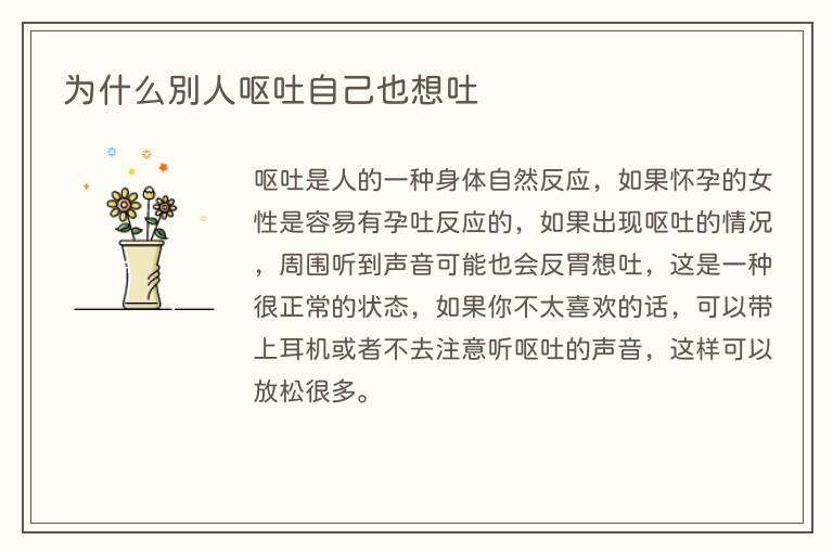这是一种身体反应,被称为同感性呕吐。当你看到或闻到别人呕吐时,你的大脑可能会产生一种身体反应,因为它误认为你自己也处于同样的食物中毒或病毒感染的状态。此外,看到或闻到呕吐物可能会引起一种强烈的嗅觉或视觉反应,导致你想吐或感到恶心。这种现象在一些人中更为常见,特别是那些对嗅觉或视觉刺激比较敏感的人。